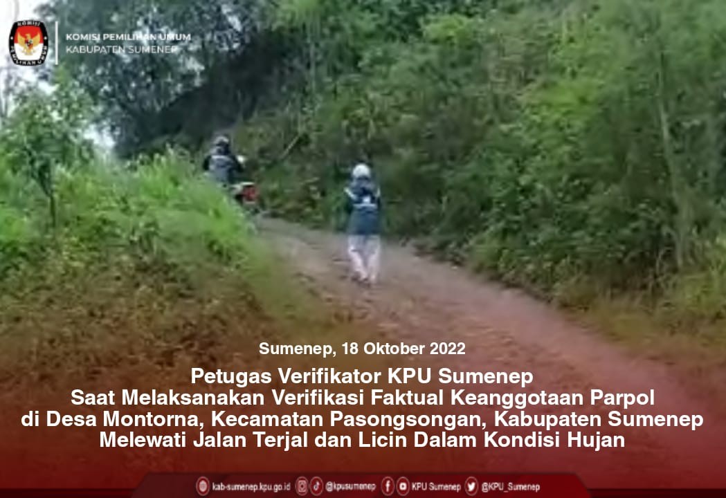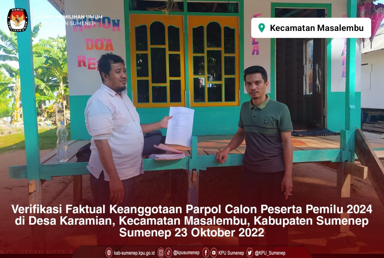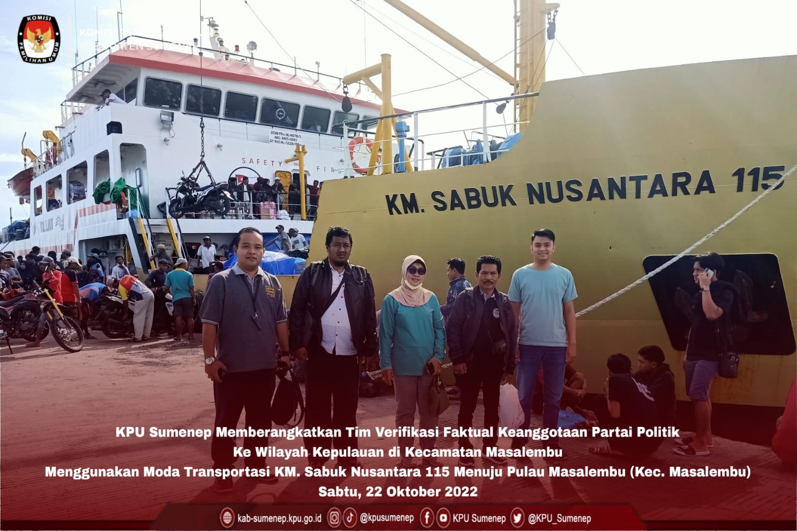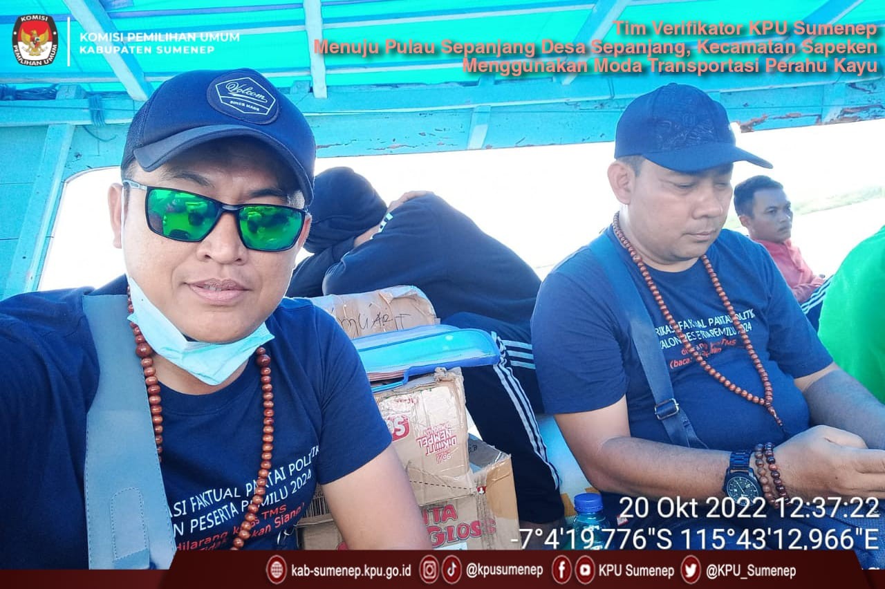 Sumenep, kab-sumenep.kpu.go.id - Pagi tadi (Minggu, 23/10/2022) tim verifikator yang beranggotakan Sdr. Mohammad Isro' dan Sdr. Suharto sampai di kepulauan Masalembu Kecamatan Masalembu dan langsung melanjutkan perjalanan ke pulau Karamian. Sesampainya disana tim verifikator langsung bergerak mendatangi tempat tinggal warga yang tercatat dalam sampling keanggotaan parpol calon peserta pemilo 2024. Kedatangan tim verifikator ini dalam rangka untuk membuktikan kebenaran identitas dan status keanggotaan Partai Politik calon peserta Pemilu 2024 dimaksud dengan cara mencocokkan kebenaran dan kesesuaian data yang diinput ke dalam Sipol dengan identitas anggota pada KTA dan KTP-el atau KK. Ada sebanyak 47 (empat puluh tujuh) anggota parpol yang dilakukan verifikasi faktual terhadap kebenaran keanggotaan parpol. Rahbini Plt. Ketua KPU Sumenep menyampaikan "Semoga tim verifikator di kepulauan Masalembu dapat menyelesaikan tugasnya sesuai target, dan kembali ke daratan Sumenep secepatnya", harapnya. "Saat ini kami masih membagi tim untuk mendatangi pulau-pulau lainnya yang belum disambangi yakni di kecamatan gayam, kecamatan nonggunong, kecamatan ra'as, dan kecamatan giligenting", terang Rahbini. Untuk diketahui oleh #TemanPemilih bahwa KM. Sabuk Nusantara 115 yang ditumpangi tim verifikator KPU Sumenep melanjutkan berlayar bukan menuju pelabuhan Kalianget-Sumenep, melainkan akan berlabuh di pelabuhan Tanjung Perak Surabaya. (kontr: Humas KPU Sumenep, Heru/ed: Heru,ATH/ foto: Suharto)