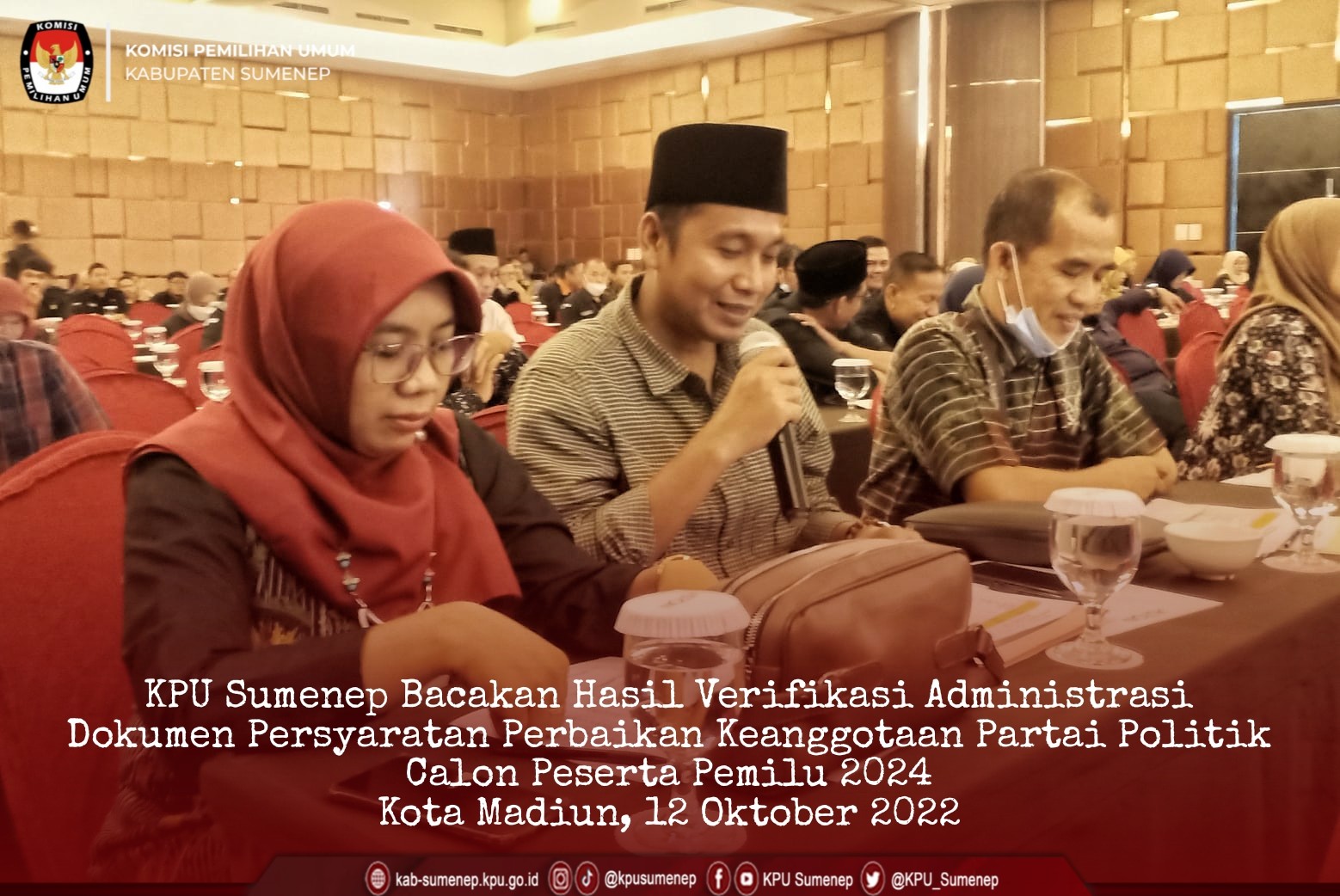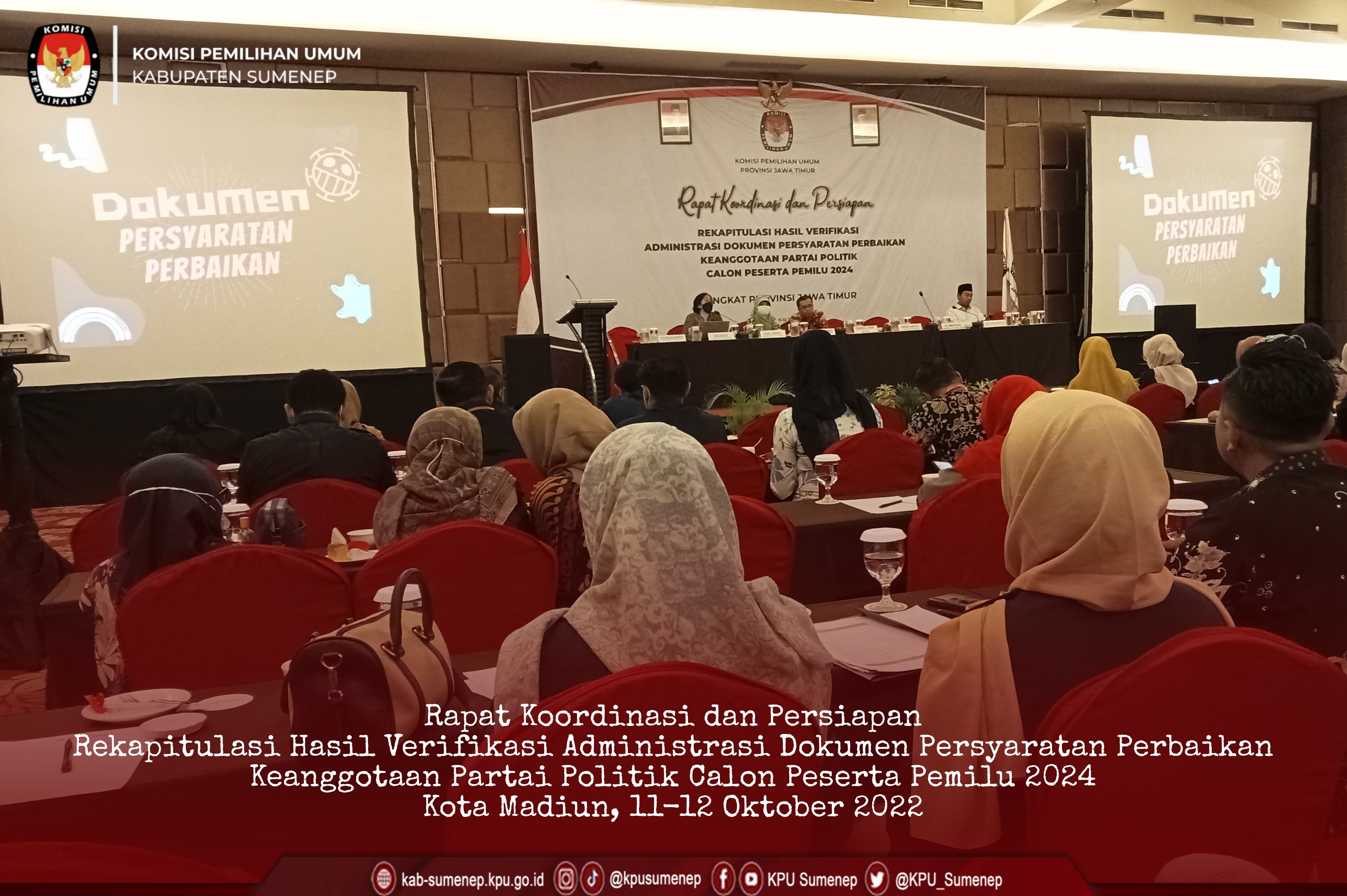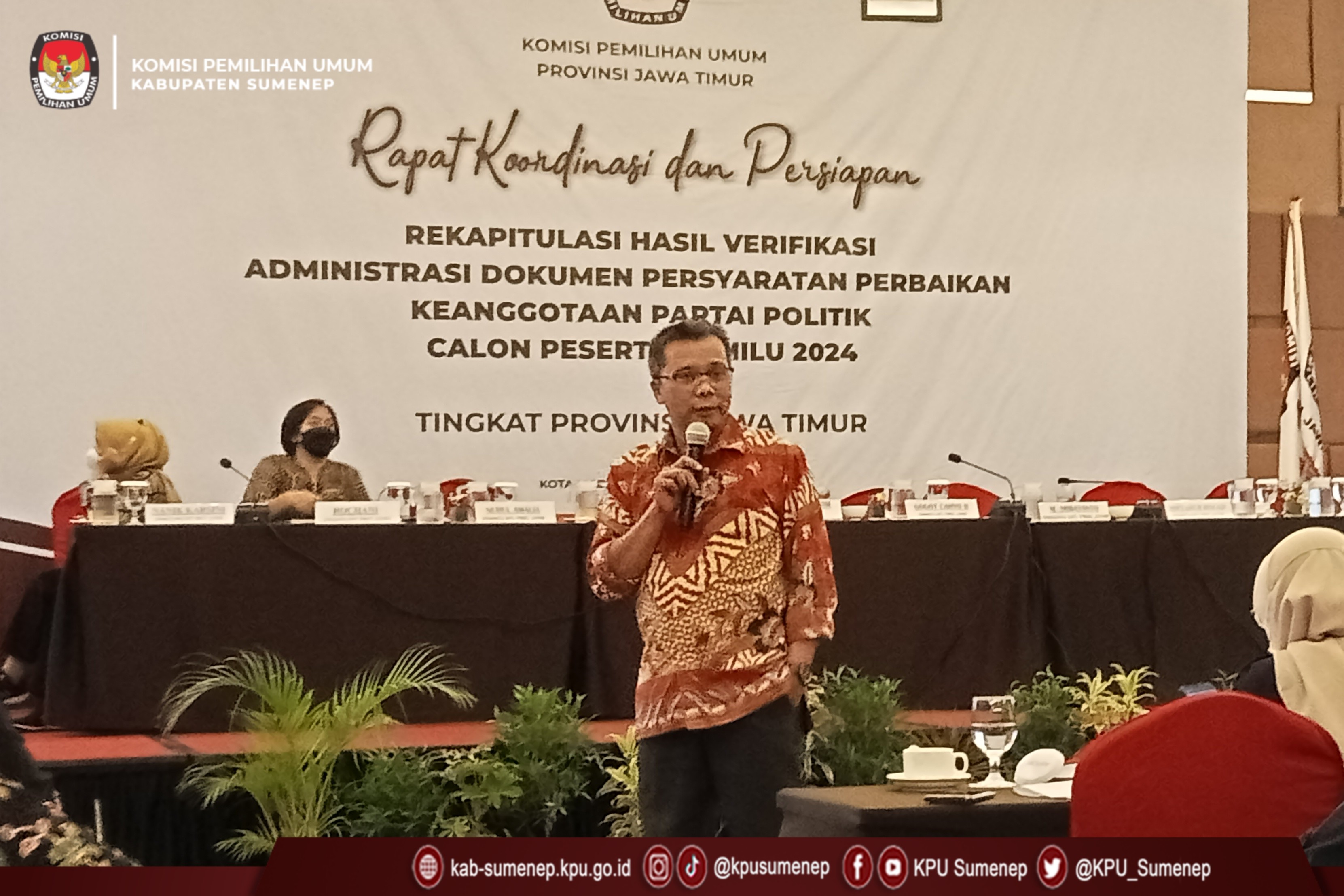 Surabaya, kab-sumenep.kpu.go.id - Selama 2 hari kedepan tanggal 13-14 Oktober 2022, KPU Provinsi Jawa Timur menggelar rapat koordinasi bersama KPU Kabupaten/Kota se-Jawa Timur di Ballroom Platinum Hotel Surabaya. Dalam rakor kali ini, KPU Provinsi Jawa Timur juga turut mengundang Bawaslu Provinsi dan Bawaslu Kabupaten/Kota se-Jawa Timur. Dalam pembukaan kegiatan rakor, berkesempatan hadir yakni Idham Holik Ketua Divisi Teknis Penyelenggaraan KPU Republik Indonesia untuk memberikan sambutan sekaligus pengarahannya. Dalam sambutannya Idham mengapresiasi kinerja pimpinan KPU Provinsi Jawa Timur dalam mengkoordinasi KPU Kabupaten/Kota selama pelaksanaan tahapan verifikasi administrasi dokumen persyaratan parpol calon peserta pemilu 2024. Beliau juga meminta terhadap persiapan pelaksanaan tahapan verifikasi faktual nanti, semua dapat menyusun jadwal pelaksanaannya dan berkoordinasi dengan Bawaslu setempat. “KPU dan Bawaslu adalah satu kesatuan yang tidak dapat dipisah. Kebersamaan menjadi modal kita, karena dengan bersama-sama tidak ada permasalahan yang tidak bisa diselesaikan dengan baik” pesan Idham. “Sekali lagi kebersamaan adalah kekuatan kita dalam penyelenggaraan Pemilu 2024”, tegas Idham. Pada kesempatan tadi, Choirul Anam Ketua KPU Provinsi Jawa Timur juga memberikan sambutan sekaligus membuka secara resmi kegiatan rakor bersama antara KPU dan Bawaslu se-Jawa Timur. Dalam sambutannya Anam menyampaikan bahwa agar KPU dan Bawaslu sama-sama memiliki persamaan pandangan terhadap pelaksanaan tahapan verifikasi faktual nanti. “Selain itu juga dibutuhkan sinergitas terutama antara KPU dan Bawaslu di masing-masing Kabupaten/Kota, seperti yang kami lakukan juga di tingkat Provinsi Jawa Timur”, pesan Anam. Untuk diketahui oleh #TemanPemilih bahwa utusan KPU Sumenep yang menghadiri kegiatan tersebut terdiri dari Rahbini Plt. Ketua KPU Sumenep, Deki Prasetia Utama Divisi Hukum & Pengawasan, Rafiqi Divisi SDM & Parmas, serta Adi Tri Hartanto Kepala Sub Bagian Teknis Penyelenggaraan Pemilu, Partisipasi & Hubungan Masyarakat. (kontr: Humas KPU Sumenep, ATH/ed: ATH/foto: ATH)