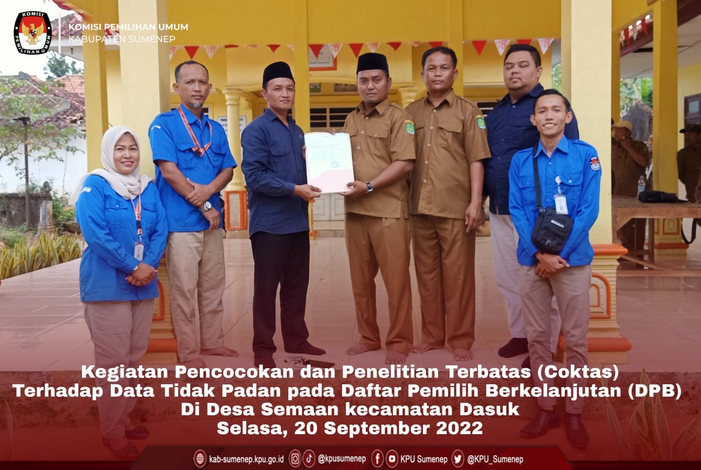 Sumenep, kab-sumenep.kpu.go.id-. Mungkin kita baru mendengarkan istilah Coktas. Ya Komisi Pemilihan Umum Kabupaten Sumenep melakukan terobosan jemput bola dalam pemutakhiran data pemilih. Coktas merupakan kependekan dari Pencocokan Terbatas. Dalam arahan apel rutin senin (19 September 2022), Kasubbag Perencanaan Data dan Informasi (Rendatin) KPU Kabupaten Sumenep Kuswandi menyampaikan bahwa sesuai dengan jadwal bahwa mulai hari ini senin 19 September sampai dengan hari kamis 22 September KPU Kabupaten Sumenep akan melakukan Pencocokan Terbatas dengan cara mengunjungi desa desa yang ada di Kabupaten Sumenep terutama desa yang ada di daratan. Walaupun tidak semua desa akan dikunjungi. Adapun secara teknis, nanti seluruh komisioner yang ada akan memimpin langsung pelaksanaan Coktas dan didampingi oleh staff sekretariat. “ Dimohon kepada sekretariat untuk menyiapkan data atau berkas yang diperlukan,” jelas Kuswandi. Dengan adanya kegiatan Coktas ini, diharapkan nantinya peran serta masyarakat dalam melaporkan data, baik data penduduk yang sudah memiliki hak pilih seperti pemilih pemula maupun pensiunan TNI/Polri maupun dari warga sipil menjadi TNI/Polri semakin meningkat demi akurasi data pemilih untuk pelaksanaan Pemilu Serentak tahu 2024 mendatang. (kontr:Heru, Editor : Heru /foto:Farid) Sumenep, kab-sumenep.kpu.go.id-. Mungkin kita baru mendengarkan istilah Coktas. Ya Komisi Pemilihan Umum Kabupaten Sumenep melakukan terobosan jemput bola dalam pemutakhiran data pemilih. Coktas merupakan kependekan dari Pencocokan Terbatas. Dalam arahan apel rutin senin (19 September 2022), Kasubbag Perencanaan Data dan Informasi (Rendatin) KPU Kabupaten Sumenep Kuswandi menyampaikan bahwa sesuai dengan jadwal bahwa mulai hari ini senin 19 September sampai dengan hari kamis 22 September KPU Kabupaten Sumenep akan melakukan Pencocokan Terbatas dengan cara mengunjungi desa desa yang ada di Kabupaten Sumenep terutama desa yang ada di daratan. Adapun secara teknis, nanti seluruh komisioner yang ada akan memimpin langsung pelaksanaan Coktas dan didampingi oleh staff sekretariat. “ Dimohon kepada sekretariat untuk menyiapkan data atau berkas yang diperlukan,” jelas Kuswandi. Dengan adanya kegiatan Coktas ini, diharapkan nantinya peran serta masyarakat dalam melaporkan data, baik data penduduk yang sudah memiliki hak pilih seperti pemilih pemula maupun pensiunan TNI/Polri maupun dari warga sipil menjadi TNI/Polri semakin meningkat demi akurasi data pemilih untuk pelaksanaan Pemilu Serentak tahu 2024 mendatang. (kontr:Heru, Editor : Heru /foto:Farid)