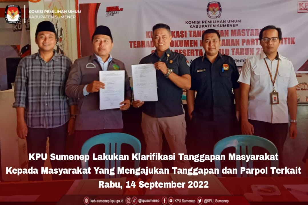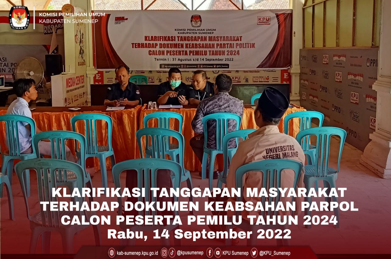 Sumenep, kab-sumenep.kpu.go id - Pasca mengunduh data tanggapan masyarakat yang disampaikan melalui portal Https://helpdesk.kpu.go.id/tanggapan, KPU Sumenep melayangkan surat undangan kepada pelapor sekaligus kepada pimpinan Parpol yang bersangkutan untuk dilakukan klarifikasi langsung. Masyarakat yang menyampaikan laporan tertulis kepada helpdesk sebagaimana ketentuan pasal 140 ayat (1) Peraturan KPU nomor 4 tahun 2022 tentang Pendaftaran, Verifikasi, dan Penetapan Partai Politik Peserta Pemilu 2024, menggunakan formulir MODELTANGGAPAN.MASYARAKAT-PARPOL yang dilampiri dengan identitas kependudukan pelapor yang jelas, bukti yang mendasari atau memperkuat laporannya, dan uraian mengenai penjelasan objek masalah yang dilaporkan. Kegiatan Klarifikasi langsung sebagaimana dimaksud dilaksanakan sejak pagi hari tadi (rabu, 14/09/2022) mulai pukul 08.00 WIB di sudut media center Rumah Pintar Pemilu Sultan Abdurrahman kantor KPU Sumenep. Pada termin I periode 31 Agustus s.d 14 September 2022 saat ini dilakukan klarifikasi atas laporan tertulis yang disampaikan melalui portal helpdesk kepada pelapor dan petugas penghubung Partai Politik. Klarifikasi yang dilakukan yaitu menggunakan metode klarifikasi langsung dengan menghadirkan masyarakat yang mengajukan tanggapan, dan mempertemukan dengan partai politik dimaksud dengan merujuk pada ketentuan pasal 39 ayat (1) Peraturan KPU nomor 4 tahun 2022. Deki Prasetia Utama, Komisioner Divisi Hukum dan Pengawasan KPU Sumenep menyampaikan "Pada termin pertama kali ini kami mengundang sebanyak sembilan masyarakat yang mengajukan tanggapan, untuk dilakukan klarifikasi langsung terkait formulir tanggapan masyarakat dan/atau laporan tertulis yang telah disampaikan melalui portal helpdesk", terangnya. "Kami juga mengundang petugas penghubung dari tujuh partai politik untuk dipertemukan langsung dengan masyarakat yang melapor. Kemudian hasil klarifikasi tanggapan masyarakat dimaksud akan dituangkan kedalam formulir MODELBATANGGAPAN.MASYARAKAT-PARPOL dan dilaporkan kepada KPU Republik Indonesia untuk dijadikan bahan pertimbangan dalam tahap penetapan partai politik peserta pemilu 2024", jelas Deki. Untuk diketahui #TemanPemilih bahwa dalam menjamin kepastian informasi, publikasi tindaklanjut tanggapan masyarakat, klarifikasi tanggapan masyarakat akan dilaksanakan dalam 4 (empat) termin, yaitu: termin pertama (1 Agustus s/d 14 September 2022); termin kedua (15 September s/d 12 Oktober 2022); termin ketiga (15 Oktober s/d 9 November); dan termin keempat (10 November s/d 7 Desember 2022). (kontr:Humas KPU Sumenep, Rezha/ed:Rezha,ATH/foto:ATH)