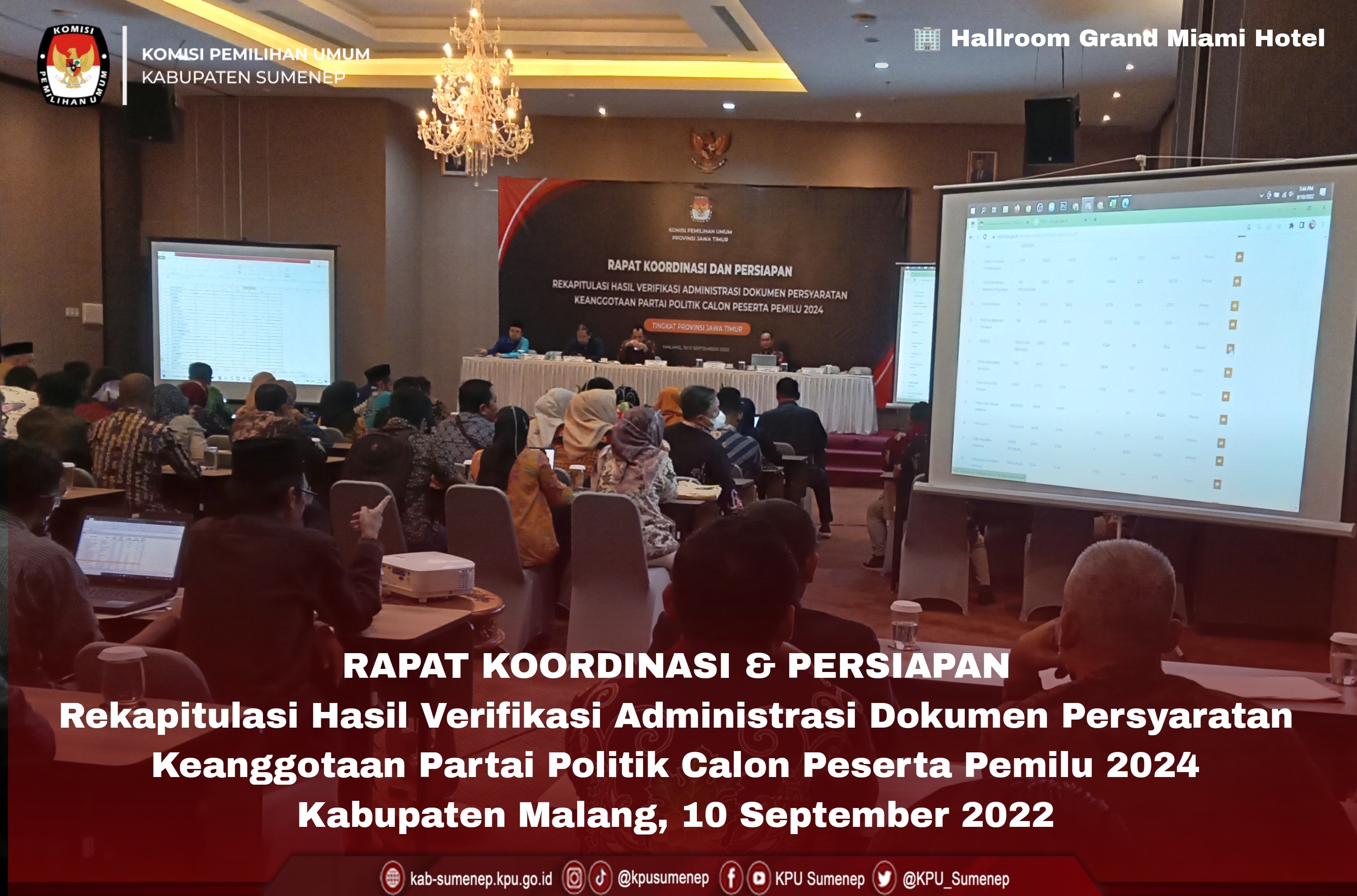 Sumenep, kab-sumenep.kpu.go.id - Pada hari ini (Sabtu, 10/09/2022) hingga esok (Minggu, 11/09/2022) KPU Sumenep mengikuti kegiatan rakor persiapan rekapitulasi hasil verifikasi administrasi dokumen persyaratan keanggotaan partai politik calon peserta pemilu 2024 di Kabupaten Malang. Rakor yang digelar oleh KPU Jatim kali ini diikuti oleh KPU Kabupaten/Kota se-Jawa Timur. Jajaran KPU Sumenep yang hadir yaitu A. Warits Ketua KPU Sumenep, Rahbini Divisi Teknis Penyelenggaraan Pemilu, Deki Prasetia Utama Divisi Hukum dan Pengawasan, Adi Tri Hartanto Kepala Sub Bagian Teknis Penyelenggaraan Pemilu, Partisipasi, dan Hubungan Masyarakat, serta Rezha Aby Purwa Staf Pelaksana selaku operator SIPOL KPU Sumenep. Kegiatan pembukaan rakor Dibuka oleh Choirul Anam Ketua KPU Jawa Timur. Dalam kesempatan siang hari tadi Beliau memberikan sambutan sekaligus membuka secara resmi kegiatan ini. Kemudian acara dilanjutkan oleh Insan Qoriawan Divisi Teknis Penyelenggaraan Pemilu KPU Jatim yang bertindak sebagai moderator dan mempersilahkan kepada komisioner yang lain untuk memberikan pengarahan umum. Nurul Amalia Divisi Data dan Informasi KPU Jatim menyampaikan agar bagian Perencanaan, Data dan Informasi agar lebih berhati hati dalam pertukaran Informasi terkait data data yang telah dan tengah dikerjakan. beliau juga berpesan agar setelah proses Verifikasi Administrasi sudah mulai longgar, agar SDM yang tersedia dapat dikerahkan untuk kegiatan Pemutakhiran Data Pemilih. Miftahur Rozaq Divisi Perencanaan dan Logistik KPU Jatim mengingatkan supaya Ketua, Divisi Perencanaan, Sekretaris dan Operator Sakti diminta standby dalam jangka waktu 1 s/d 2 hari ke depan karena akan dilakukan beberapa revisi terkait masalah anggaran. Gogot Cahyo Baskoro Divisi Sosdiklih Parmas KPU Jatim mengingatkan bahwa kegiatan publikasi terkait tahapan atau kegiatan kepemiluan adalah sesuatu yg "seksi" dan ditunggu masyarakat, maka wajib dipublikasikan. Namun perlu diperhatikan, agar lebih selektif dalam penyampaian Informasi. Pelihara integritas dan kepatuhan tegak lurus kepada lembaga secara berjenjang. Mohammad Arbayanto Divisi Hukum dan Pengawasan menjelaskan bahwa klarifikasi secara langsung melalui teknologi Informasi adalah sesuatu yang resmi dan sudah diakui secara hukum. Untuk diketahui #TemanPemilih bahwa kegiatan rakor dilanjutkan pada malam hari mulai pukul 19.00 WIB bertempat di Hall lantai 7 Hotel Grand Miami Kabupaten Malang dengan agenda pembacaan hasil vermin berdasarkan berita acara masing-masing KPU Kabupaten/Kota. (kontr: Humas KPU Sumenep, Rezha/ed: Rezha, ATH/foto: Rezha)