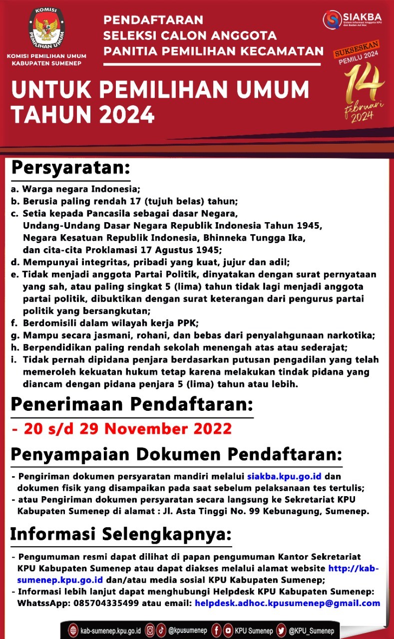 Menjelang proses rekrutmen PPK, KPU Sumenep mengimbau masyarakat, khususnya yang ingin mendaftar sebagai penyelenggara badan adhoc, agar lebih dahulu mengecek Nomor Induk Kependudukan (NIK) masing-masing di portal info pemilu di alamat https://infopemilu.kpu.go.id/Pemilu/Cari_nik.