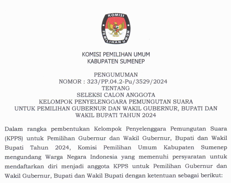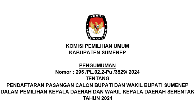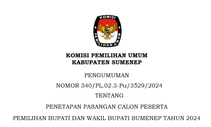 Komisi Pemilihan Umum Kabupaten Sumenep telah mengumumkan Hasil Penelitian Perbaikan Persyaratan Administrasi Calon Bupati dan Wakil Bupati Sumenep Tahun 2024 untuk Pasangan Calon ACHMAD FAUZI WONGSOJUDO, S.H., M.H & KH. IMAM HASYIM, S.H., M.H serta KH. ALI FIKRI, S.Ag, M.Pd.I & KH. MUH. UNAIS ALI HISYAM, S.Sos, M.Pd.I yang dinyatakan memenuhi syarat melalui pengumuman yang dapat diakses pada tautan berikut: