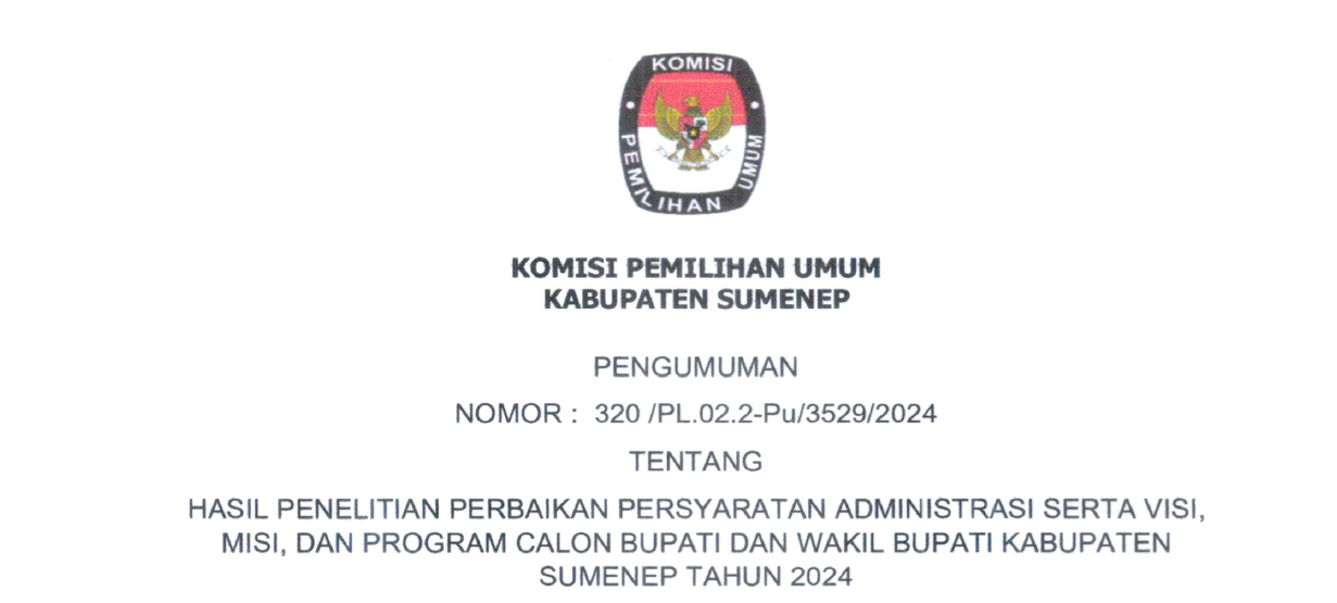 Unduh Dokumen > PENGUMUMAN HASIL PENELITIAN PERBAIKAN PERSYARATAN ADMINISTRASI PASANGAN CALON BUPATI DAN WAKIL BUPATI SUMENEP TAHUN 2024