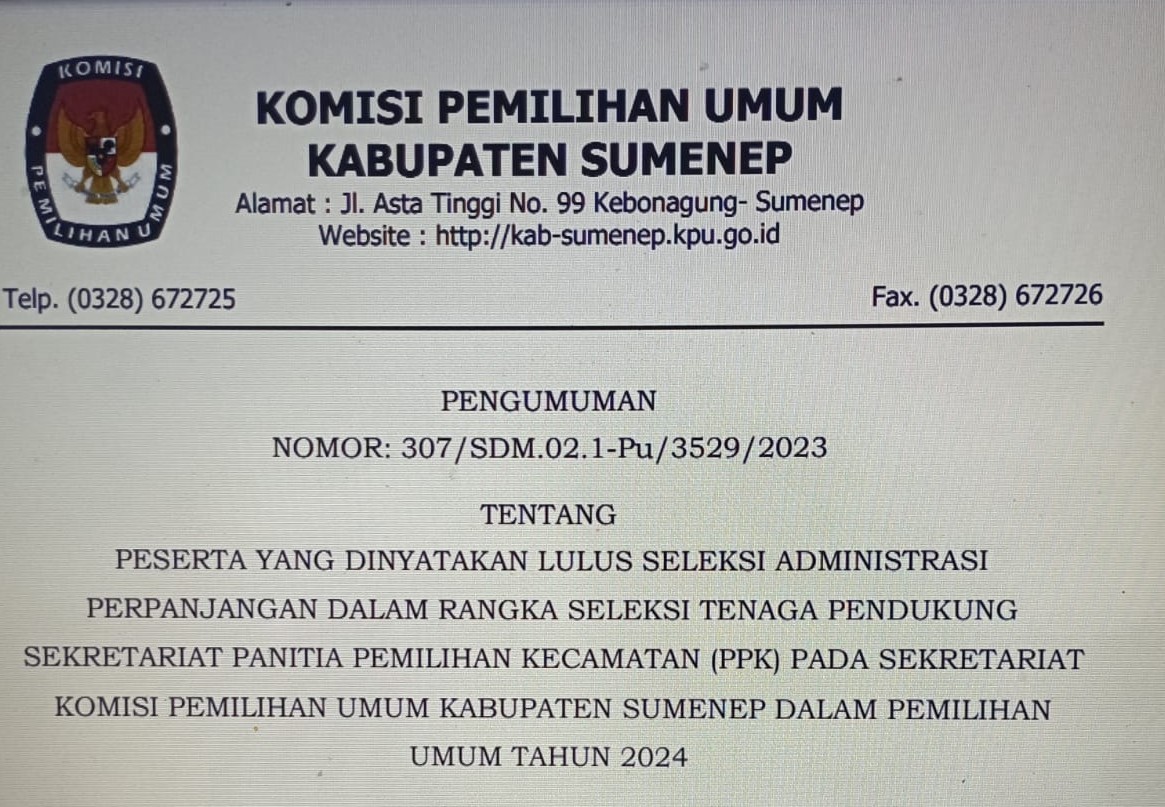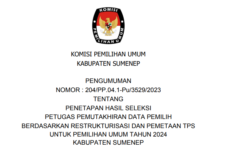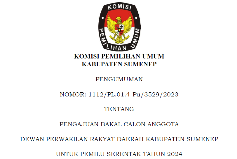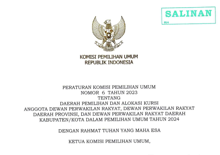 Jakarta, kab-sumenep.kpu.go.id - Komisi Pemilihan Umum (KPU) Republik Indonesia telah menerbitkan Peraturan Komisi Pemilihan Umum Nomor 6 Tahun 2023 tentang Daerah Pemilihan dan Alokasi Kursi Anggota Dewan Perwakilan Rakyat, Dewan Perwakilan Rakyat Daerah Provinsi, dan Dewan Perwakilan Rakyat Daerah Kabupaten/Kota Dalam Pemilihan Umum Tahun 2024 <<KLIK DISINI>>