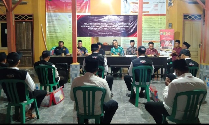 Guluk Guluk-Sumenep,kab-sumenep.kpu.go.id-. Petugas Pantarlih mendatangi rumah Komisioner KPU Sumenep, Mustafid, di Desa Guluk-guluk, Kecamatan Guluk-Guluk. Ini dilakukan untuk melakukan pencocokan dan penelitian (coklit) data pada Pemilu 2024 mendatang. Coklit tersebut dilakukan sejak tanggal 12 Februari hingga 14 Maret 2023 mendatang. (Sabtu, 18 Februari 2023). Dalam kesempatan itu pula, Komisioner KPU Sumenep Mustafid meminta agar seluruh petugas Pantarlih bekerja dengan sepenuh hati untuk mendatangi rumah-rumah warga. Seperti yang sering dipesankan oleh komisioner lain, jangan ada joki pantarlih dan hanya kerja di atas meja. "Bekerja dengan profesional, integritas dan sepenuh hati. Karena data pemilih yang dilakukan oleh Pantarlih itu harus akurat," jelasnya. Pihaknya berharap kepada masyarakat apabila didatangi petugas Pantarlih, sedianya bisa berkoordinasi dengan baik dan memberikan data yang sah. Petugas Pantarlih katanya, harus memastikan bertemu dengan pemilih dan melakukan coklit. Petugas melakukan coklit dengan mencocokan data nama, alamat dan Nomor Induk Kependudukan (NIK) berdasarkan Kartu Tanda Penduduk (KTP) dan Kartu Keluarga (KK). Ketua PPK Kecamatan Guluk-guluk melalui anggotanya, Imam Hanafi mengatakan bahwa Pantarlih pada Pemilu 2024 adalah ujung tombak dalam pemutakhiran dan penyusunan daftar pemilih. "Saya berharap teman-teman Pantarlih dapat menyelenggarakan tugas dengan sebaik-baiknya," tutup Imam. (Kontributor : Hanafi/Editor: Heru / foto: Imam).