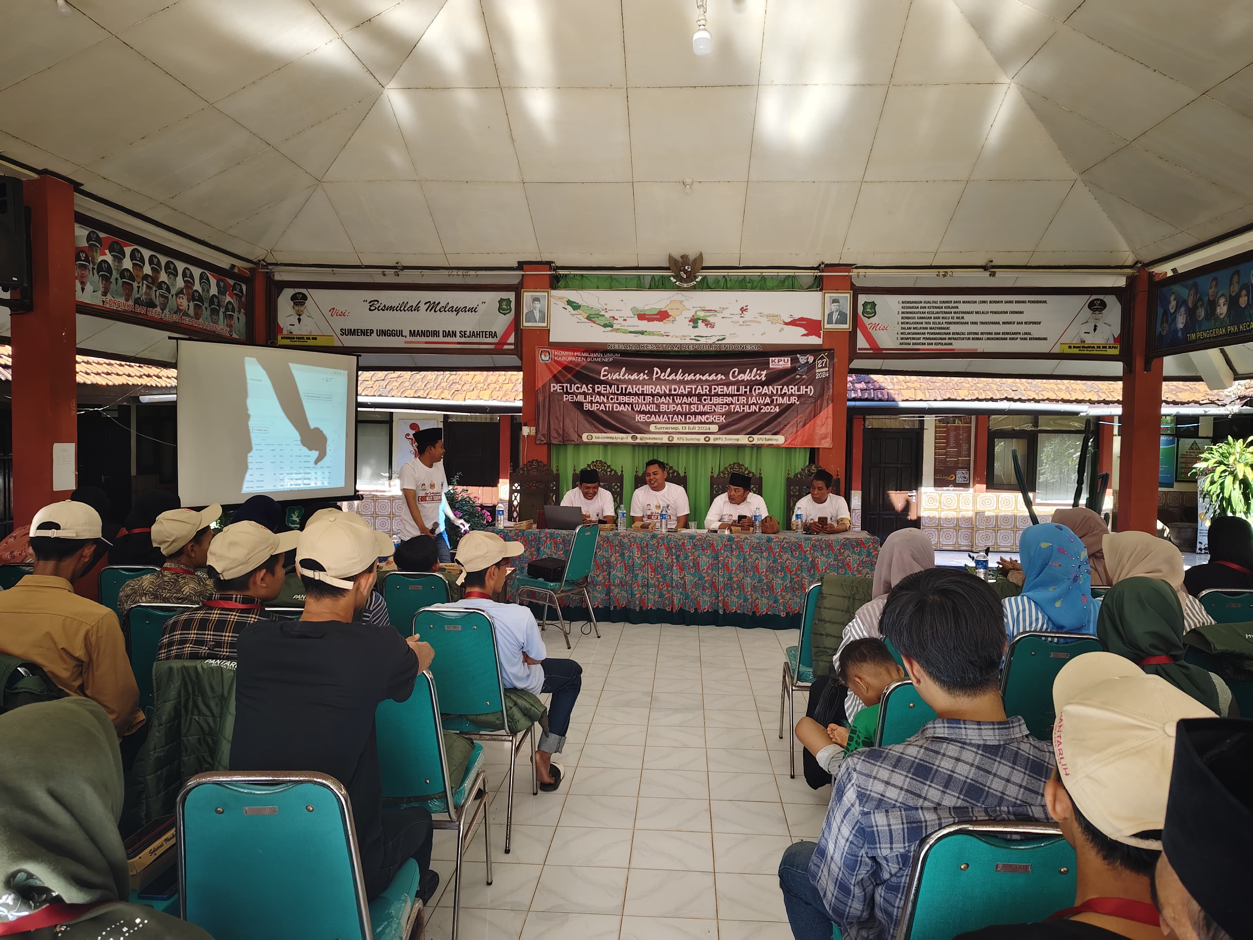 Batu Putih - Sumenep,kab-sumenep.kpu.go.id-. Panitia Pemilihan Kecamatan (PPK) Kecamatan Batuputih, Kabupaten Sumenep, Madura, Jawa Timur gelar Rapat evaluasi tahapan coklit Minggu 21, Juli 2024. Kegiatan yang bertempat di Pendopo Kecamatan tersebut di hadiri langsung oleh Seluruh PPK, Panitia Pemungutan Suara (PPS), dan 138 Petugas Pemutakhiran Data Pemilih (Pantarlih) se-Kecamatan Batuputih. Moh. Saleh selaku Ketua PPK Batuputih Menyampaikan dalam sambutannya berterima kasih atas kerja kerasnya Pantarlih dalam melaksanakan pencocokan dan penelitian pemutakhiran data pemilih untuk pemilihan Bupati dan Wakil Bupati Kabupaten Sumenep, Gubernur dan Wakil Gubernur Jawa Timur di Desanya masing-masing. "Kami sangat mengapresiasi kepada seluruh Pantarlih yang telah bekerja sesuai dengan tupoksinya, dan Aplikasi E-Coklit di Kematan Batuputih ini Sudah selesai 100%”. Terang E’eng sapaan akrab Moh. Saleh Pria asli kelahiran Desa Bulla'an itu juga berharap kepada pantarlih untuk terus menyempurnakan hasil coklit dan sesegera mungkin untuk menindaklanjuti masukan atau tanggapan baik dari masyarakat atau Panwas Kelurahan/Desa (PKD) Coklit pemutakhiran data pemilih dimulai dari 24 Juni s.d 24 Juli 2024 dan hari ini memasuki minggu ke-4 pelaksanaan coklit sehingga progress penyelesaian coklit harus terus dipantau. Selain itu, Maimon selaku Divisi Data PPK Kecamatan Batuputih, dalam sambutannya juga berharap agar pelaksanaan coklit dan pelaporan di setiap tingkatan sesuai dengan jadwal agar dapat segera dilaporkan kepada KPU kabupaten Sumenep. "Kami berharap agenda Pencoklitan Pemilihan Gubernur dan Wakil Gubernur Jawa Timur Bupati dan Wakil Bupati Sumenep 2024 ini sesuai dengan schedule yang telah ditetapkan". Pungkasnya. (Kontributor : Fikri/Editor: Heru/ foto: Ahmad).