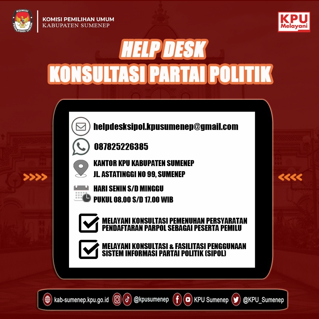 Helpdesk Konsultasi Partai Politik INFOGRAFIS HELPDESK <<KLIK DISINI>> Share this artikel : Dilihat 9 Kali.